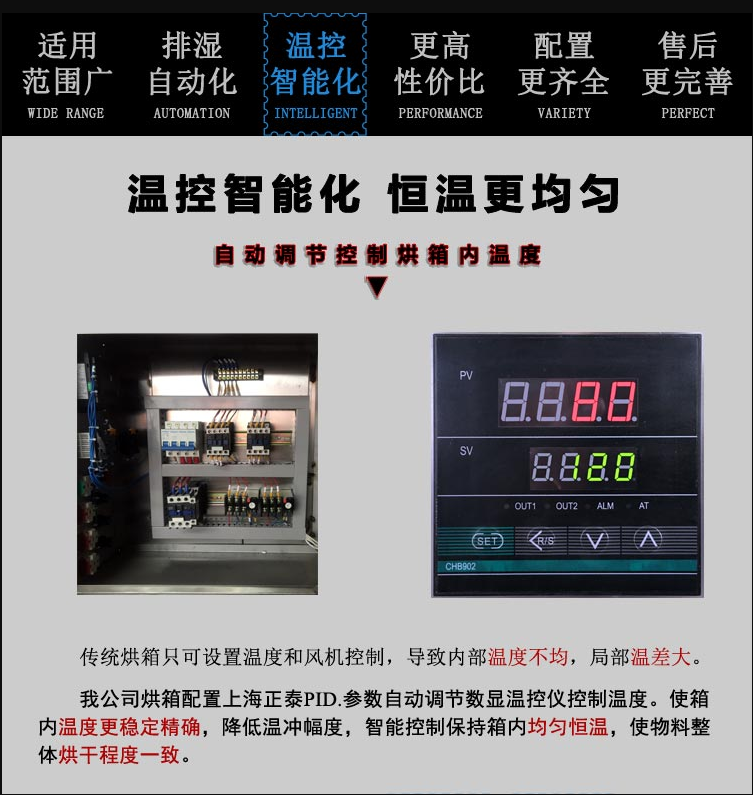1、烘箱采用具有PID控制方式的數(shù)顯溫度控制儀,配用熱敏元件探頭組成自動恒溫控制,控溫精度靈敏,選溫方面,常溫至250,任意選擇設定。烘箱的工作室內(nèi)溫度可以從儀表直接讀出。